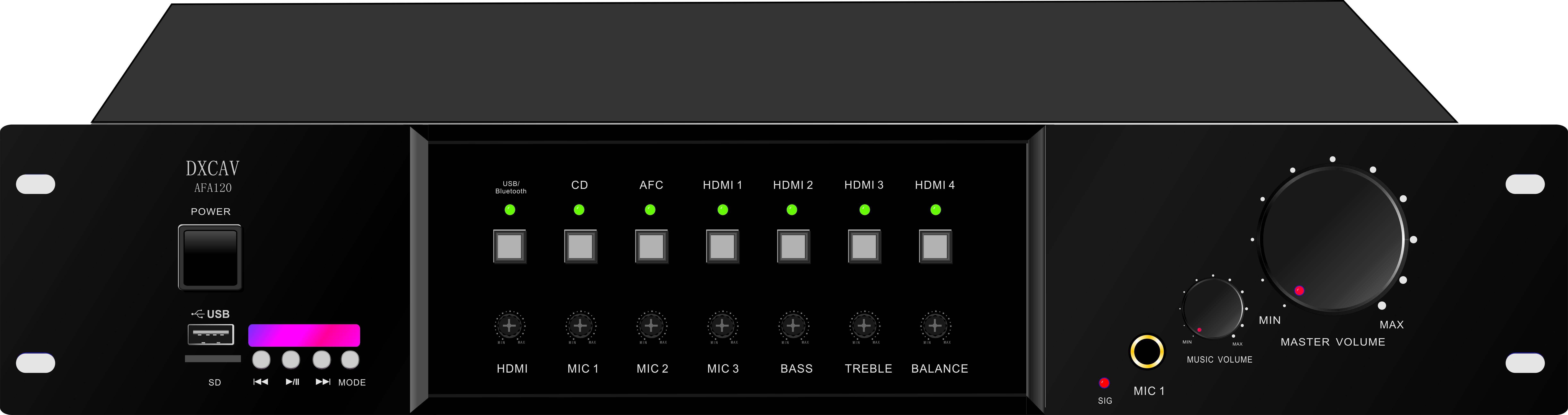 4、5種音頻輸入信號切換: HDMI高清音頻,1路立體聲輸入可外接CD機(jī)等音頻輸入,USB接口可直接讀取U盤音頻信號,藍(lán)牙播放可通過手機(jī)或平板電腦傳輸音頻信號, SD卡插入直接讀取音頻信號;
